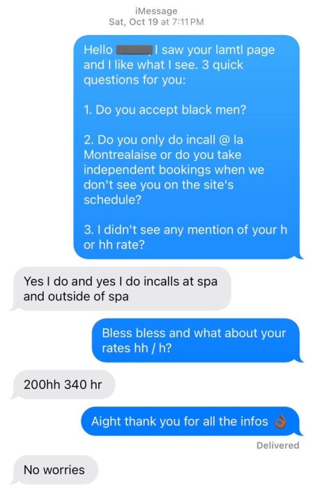Like I said, this information isn't on twitter for safety reasons..I read ads all the way down personally. As many here may have already noticed I’m more of a PSE oriented type of trick (basically come in, bust a nut and leave) Here are few exemples of my interactions when reaching out to prostitutes to inquire about their services and rates. I’m always polite and go straight to the point avoiding useless back and forth texting.View attachment 84792View attachment 84792View attachment 84795