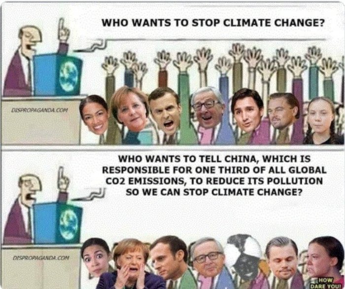 The message is about the hypocrisy of Team climate change, not China.