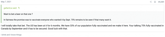 You were going on about how behind Canada was and Canada's inability to buy or make vaccine. I challenged Canada would catch up and pass the US. What we lack in brawn we make up with Brains. I quoted Trudeau saying was to have 75% of those that wanted a vaccine could get it. You mocked the fact we were at 3% while you were at 33%. I bet you a beer with clarity of what the 75% represented.