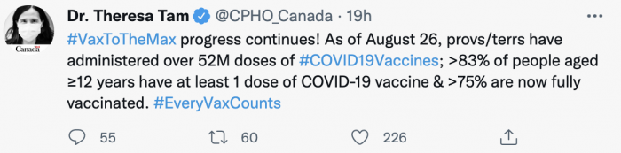 Dr. Google says that Canada is at 67.6% fully vaccinated not 75%. Welcome to September! I don’t recall the terms of the bet (I’ve had more important things to do) but I know that neither country hit the 75% fully vaccinated number. So I’m guessing we have a draw. Either way, I’m happy to see both our countries continuing to get vaccinated and hope that both countries get to 80% or higher.
