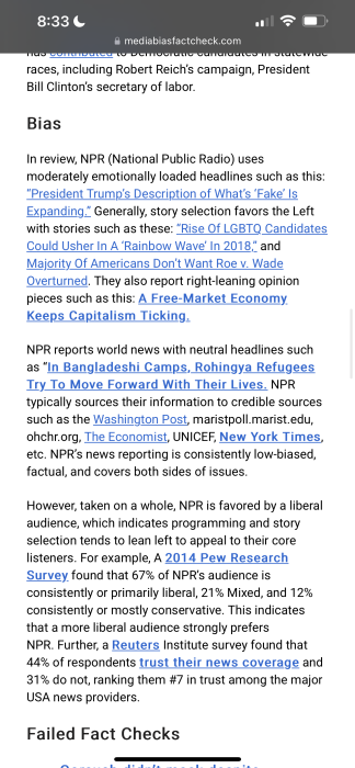 “NPR is favoured by a liberal audience which indicates programming and story selection tends to lean left to appeal to their core listeners”.