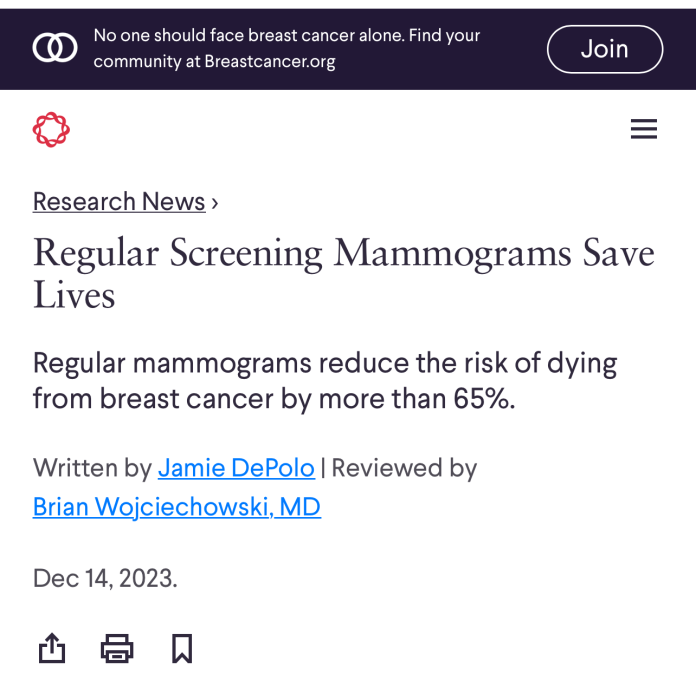 Mammograms? They hurt like hell and there’s growing evidence showing they can actually spread cancer cells instead of detecting them. But sure, let’s all pretend that breastcancer.org - an organization swimming in millions of dollars in funding - has my Breast interest at heart.