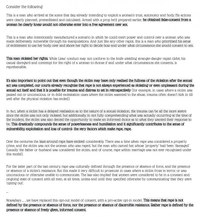 We are mostly talking about the law and I am basically saying that... If I was jury, my judgement would be: it was theft or fraud but not rape.