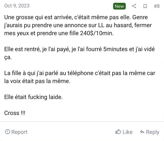 C'est évident que ce n'est pas bullet proof, qu'il serait tout de même possible d'être désobligeant mais avec moins de possibilité d'élaborer sur le sujet. De plus ça éviterais d'avoir trop de détails dans les reviews comme ceux qui pense écrire un scénario de film de fesses. Nous savons tous que ce hobby est HAUTEMENT ymmv donc ce qu'un john peux recevoir comme service d'une compagne, il est probable que l'expérience d'un autre John soit totalement différent. Il est possible qu'en procédant ainsi les attentes serait moindre et possiblement, moins de harcèlement, pour vous mesdames, de ceux qui ne reçoivent pas le même service qui fut décrit très explicitement en long et en large inutilement