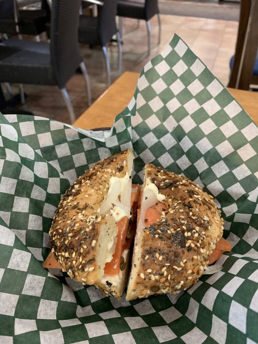 Here is a Montreal "Everything" Bagel with cream cheese and lox which my phone says I ordered on my very last trip to Montreal, May 4, 2019, in lower Westmount. I will be damned if I can remember where I ate that bagel, but its something I always order when in Montreal. It sure looks good. On that trip I was in Montreal with NYCBadBoy, and maybe the BadBoy will remember because I took most of my meals with him: