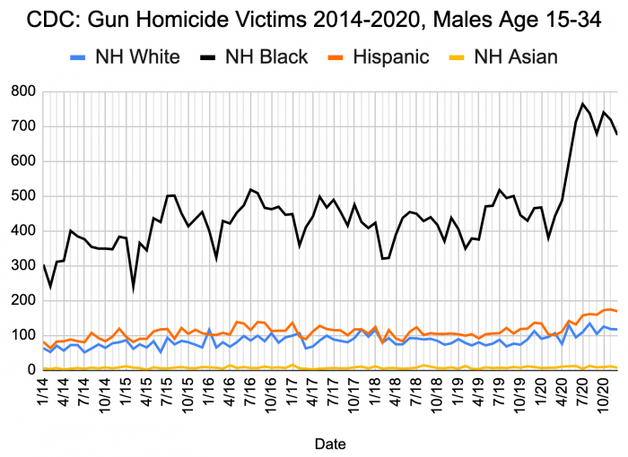 So one problem with the CDC’s demographics is it doesn’t tell you the demographics of the perps. But by focusing on victims in the lively sector — young men — you can get a pretty good sense of who is doing the shooting as well.