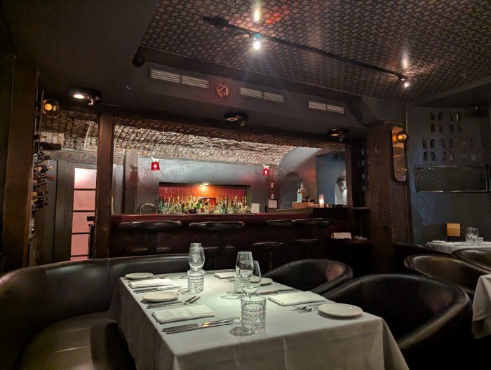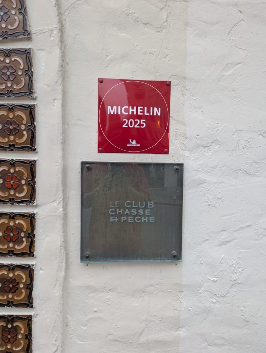 So, imagine this: We start our evening at this little hidden gem, Le Club Chasse et Pêche. You wouldn’t even know it’s a Michelin-recommended restaurant just by looking at the outside. The facade is pretty discreet—no flashing signs or big names, just a small plate with the restaurant’s name and the little Michelin plate next to it. It's almost like a secret you have to know about to find.