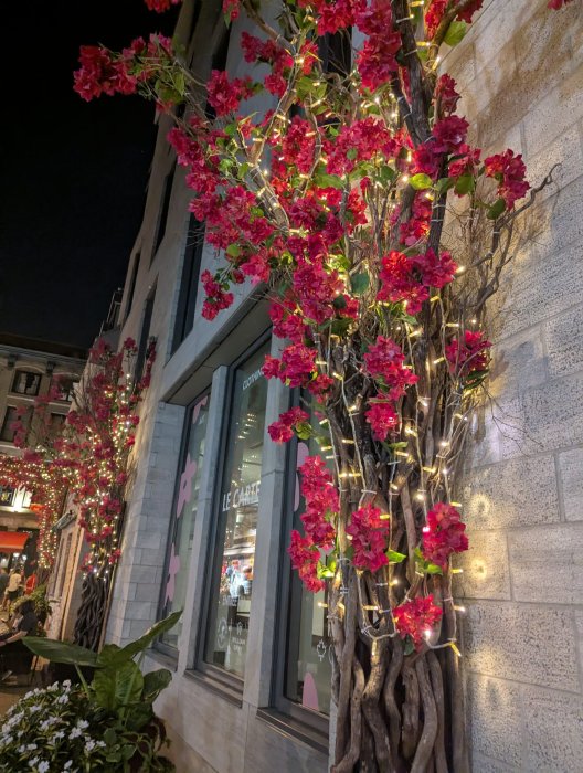 After we’re done with dinner, we take a leisurely stroll through Old Port. The streets are quiet, but alive with the charm of the city. We walk down this beautiful little alley that’s lined with trees—these tall trees with sharp purple flowers that almost seem to glow in the night. It’s like stepping into a secret garden right in the middle of the city. The whole walk feels surreal, like we’re in a movie.
