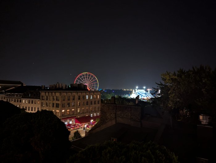 And as we sip our drinks, the sun slowly disappears behind the horizon, and the lights of the city start twinkling. Off in the distance, you can spot the Ferris wheel and the Chapiteau from Cirque du Soleil, glowing against the fading sky. It’s peaceful—like time just slows down, and all that matters is this moment.