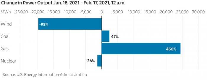 Between 12 a.m. on Feb. 8 and Feb. 16, wind power plunged 93% while coal increased 47% and gas 450%, according to the EIA. Yet the renewable industry and its media mouthpieces are tarring gas, coal and nuclear because they didn’t operate at 100% of their expected potential during the Arctic blast even though wind turbines failed nearly 100%.