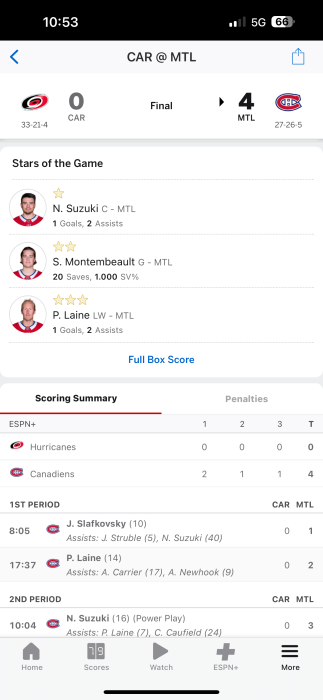 This is so stupid i won’t bother to answer. LolWhy does Suzuki get 1st star and Laine 3rd star when both players had 1 goal and 2 assists? Is Suzuki's 3 points worth more than Laine's? I don't understand the math please explain.