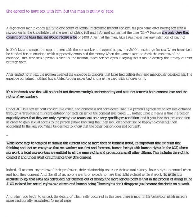Not using the "rape case" inappropriately, to keep the sense of the term is one goal here, but also cases like that (escort reporting getting rape because they didn't get paid) can only bring the "sex work" decades back: people will again assume that you can't willingly do this job, that clients are rapist and so it should be made completely illegal.