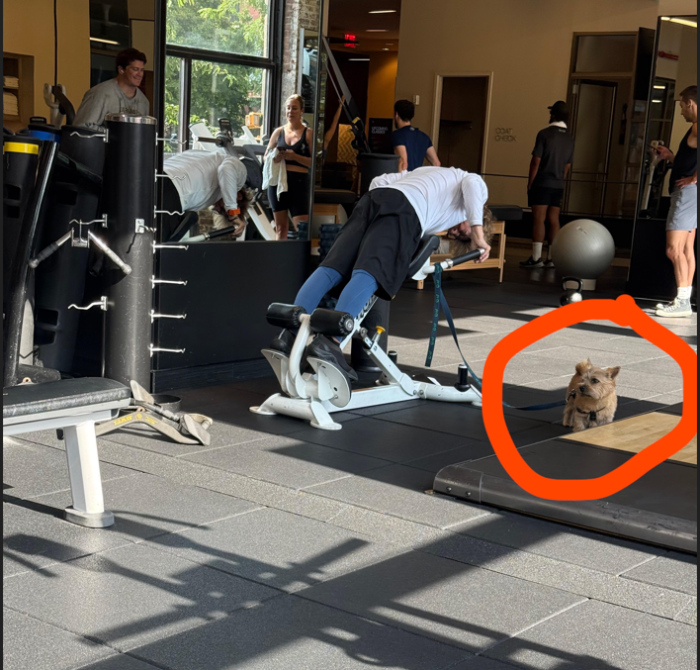 This guy has been doing this a few times. Cute dog but does not belong in the gym. Definitely not a service dog and/or emotional support animal. Right next to the squat rack/power lifting platform. One day this poor dog may end up as road kill if someone accidently drops a 45lb weight on it.