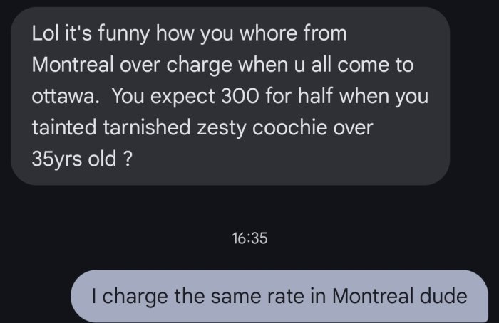 I came to Montreal 2012 with a master degree and 10 years relevant work experience as a financial analyst. Your lovely gouvernement lied to me that I am a qualified worker, so I was obliged to restart everything from scratch - college, bachelor, master combined always with a full time job. For 10 years every day I went out at 7.00 am and came back at 23.30 at home. 10 years your lovely government compared my french and speed with those to all these great young people aged 20-22. Why this is so important - because my final assessment depends on the average one made by all these great young people way faster than me and better in french. However I did survive and after years of hard work and study I obtained the auditor designation which allowed me to work for Big 4. Each week I had Sunday afternoon for me and I needed to keep this feeling that I am still alive and I am still a man. At that moment I started to use escort services. During all these years I met some girls that we made passionate love which kept me alive. Around the beginning of 2023 I met one woman (I can not enter in details because she is part of the Hall of fame now). I meet this woman every week which costs me $2000 on a monthly basis. I spent a lot of money on ridiculous things, but I never regret every one single dollar spent on her. I completely understand that there is absolutely no future in this because we have two completely different life paths. However for now we make great love and this works perfectly for us.