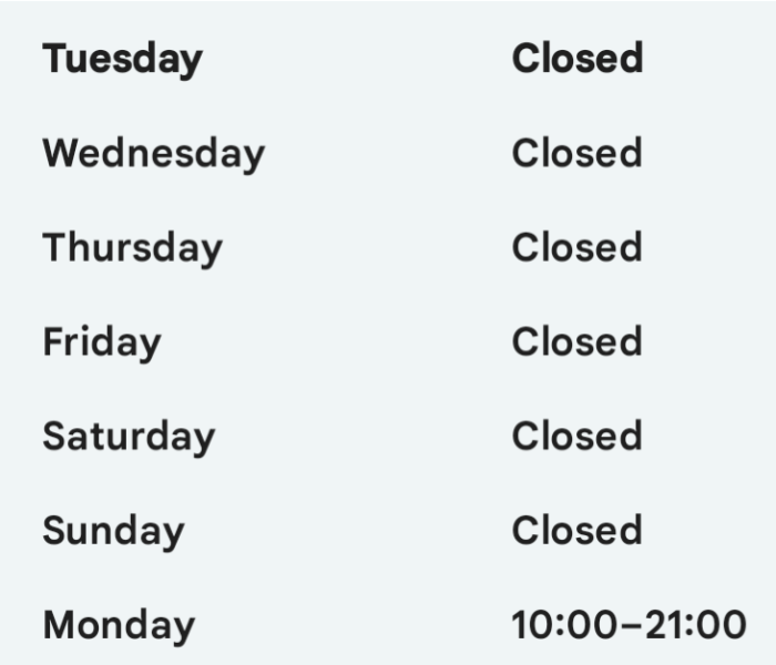 Update: should have waited to have lunch on Monday. My backup plan was not stellar.Looking for something to eat for lunch and then stumble onto this restaurant opening hours: